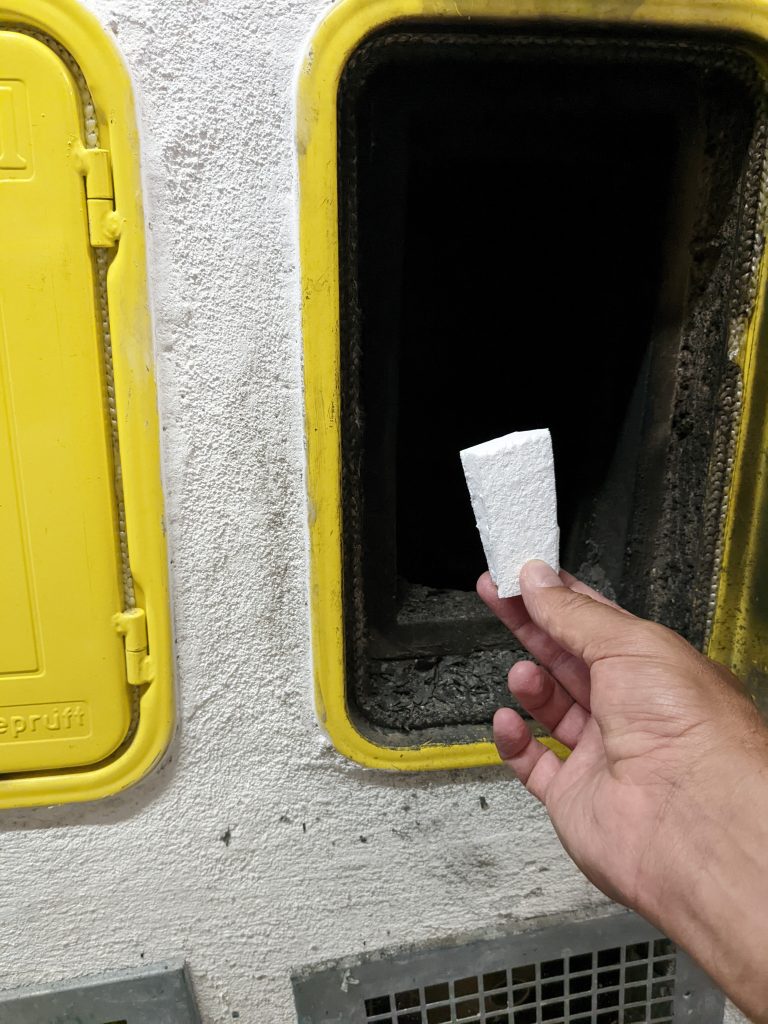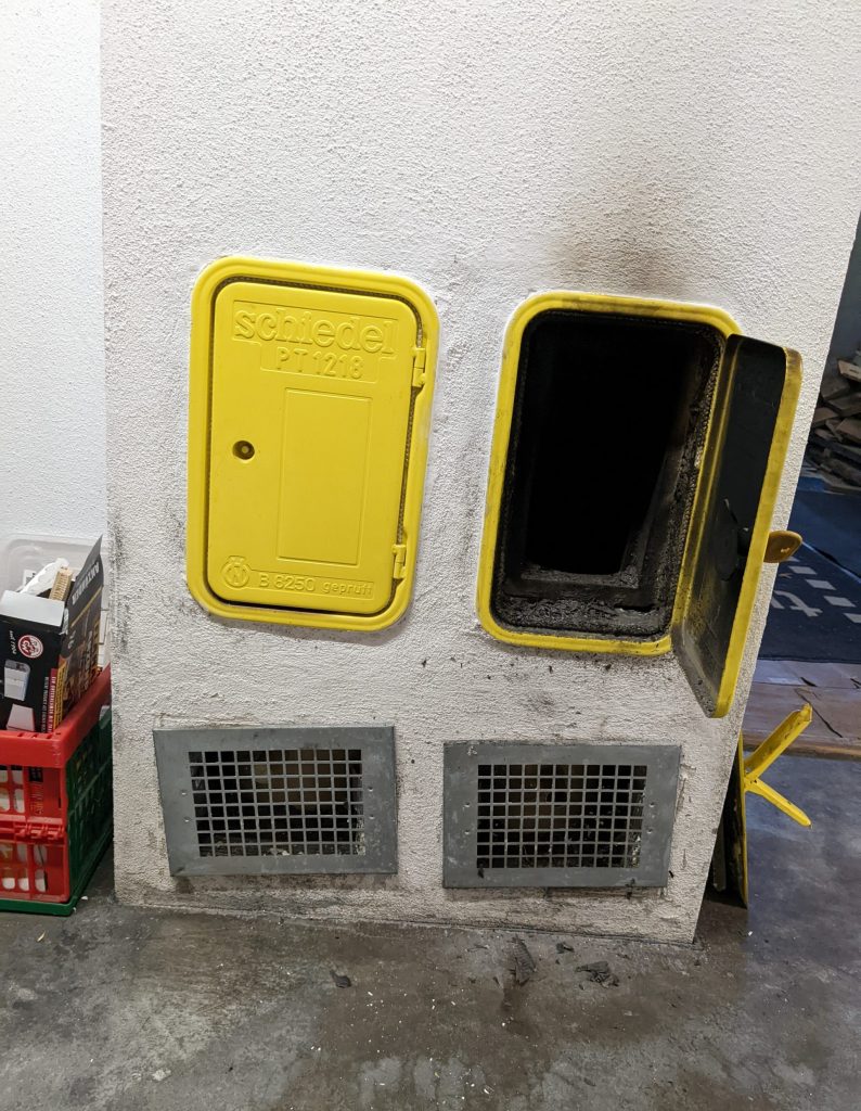 Obere Tür des Ofens öffnen, mit dem Blechschaber (rechts neben dem Ofen zu finden) die Asche durch den Gitterrost in den darunter liegenden Auffangbehälter schieben, Anzündwürfel – erneut ein ca. 3×3 cm großes Stück – anzünden und reinwerfen. Anschließend Holz in den Ofen legen und obere Ofentür schließen.